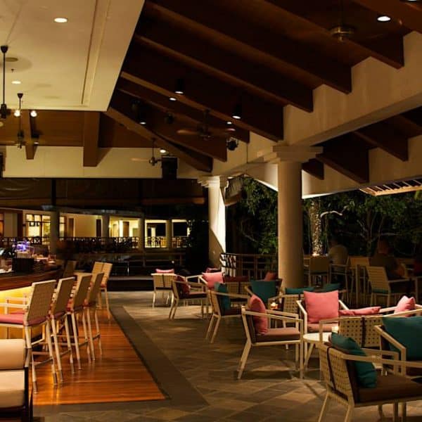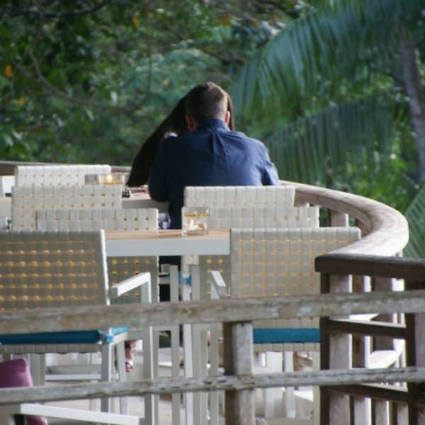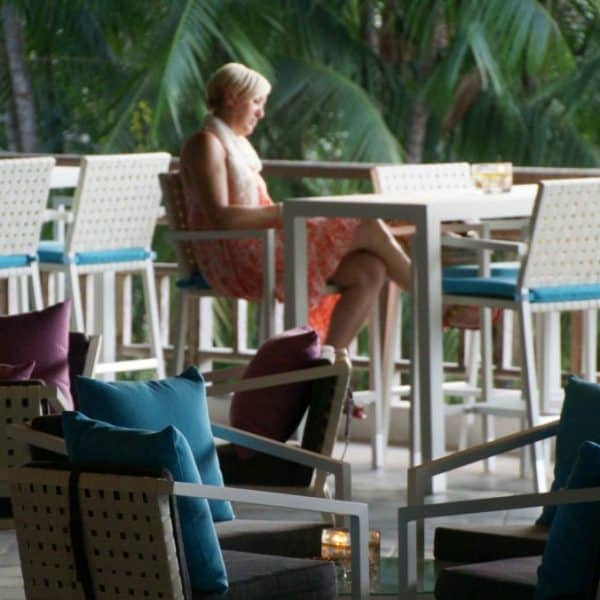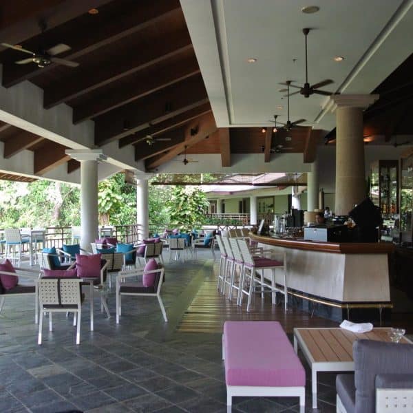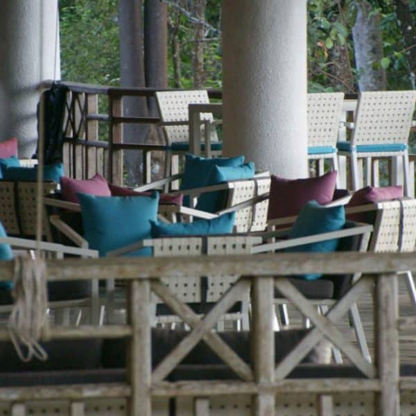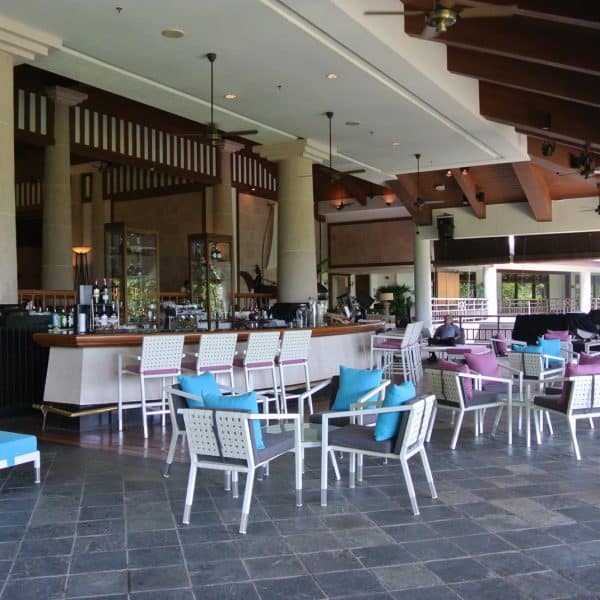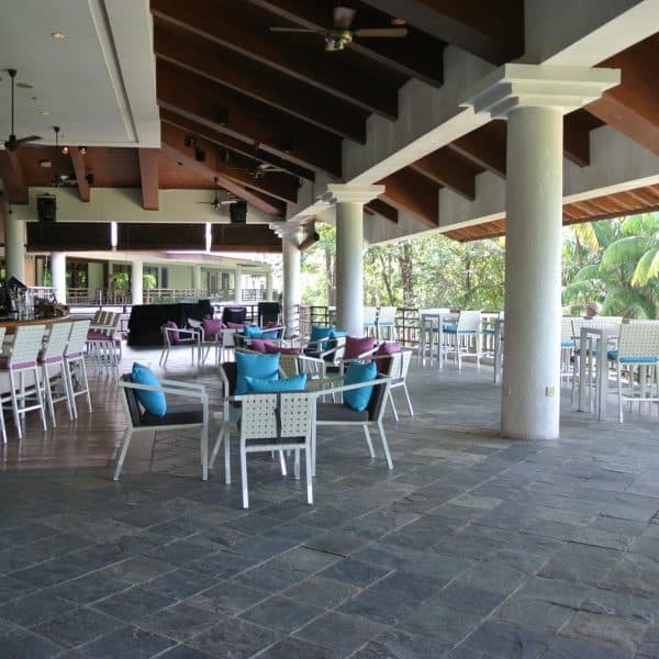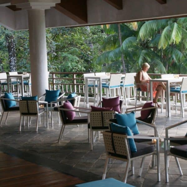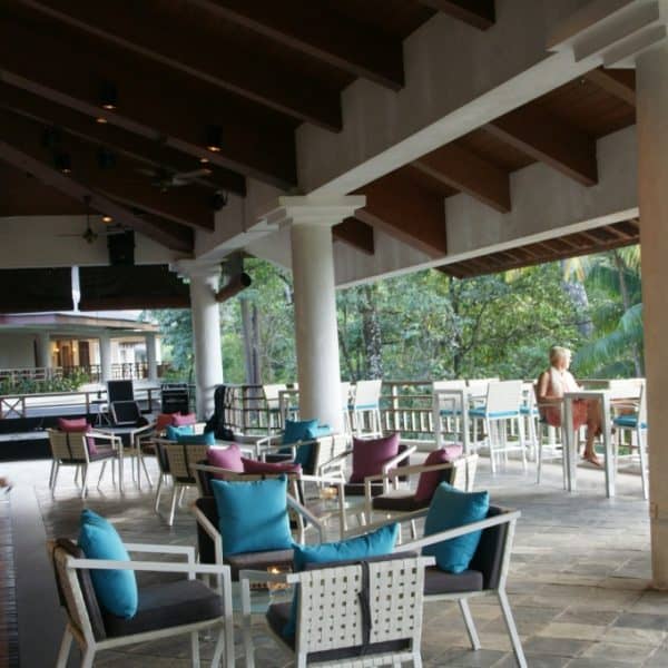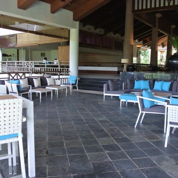 At this luxurious island resort, what better way to celebrate the place by having our staple white rattan chairs and tables? With bright blue and pink cushions, they provide a stark contrast of colours that easily attract both workers and guests.